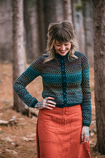 Ever since the release of Shifty, 4 years ago, I’ve had requests for a cardigan version. I am so thrilled to finally be able to bring this wee cardi to life! The shifting colors and fun texture will keep you knitting “just one more row!” all the way to the end, and it is sure to be one of the most eye-catching pieces in your wardrobe! This sweater is knit from the top down, in the round, using stranded colorwork. It is knit seamlessly and then steeked.