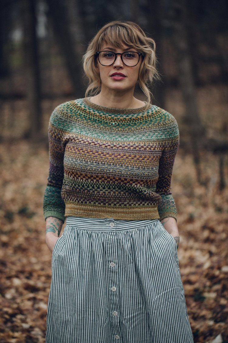 This sweater is all about being playful and having fun with color! One colorway is used consistently as the “background” while 3 contrasting colors make up the textured colorwork using the Mosaic knitting method! This is one of the most versatile pieces in my wardrobe - it looks fabulous with high waisted pants and skirts, layered under overalls and pinafores or over dresses and tunics!